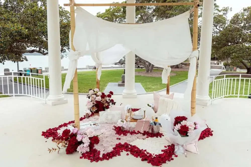 Steven surprised Mary with a stunning Balmoral picnic proposal setting at Edwards Beach. The setting was decorated with gorgeous pink and red flower arrangements, pillows, cushions and a carpet for them to sit on, drinks, and candles. Steven engaged My Proposal Co. as his proposal planners in order to make sure their proposal was unforgettable. We helped him come up with the perfect idea and included a professional photographer to capture their special moment!