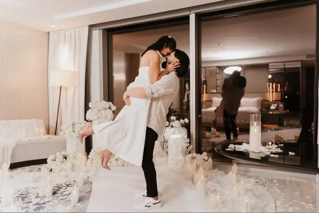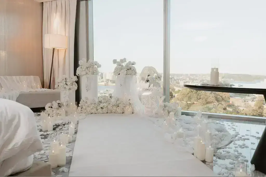 Alexander surprised Alysha with a gorgeous proposal at the stunning Crown Towers Sydney. This intimate hotel proposal setting was styled with a white carpet aisle surrounded by elegant white roses, candles and a light up “Will You Marry Me” sign. Once Alexander began engaging with My Proposal Co. to be his proposal planners, he was sure to that their special day would be unforgettable!