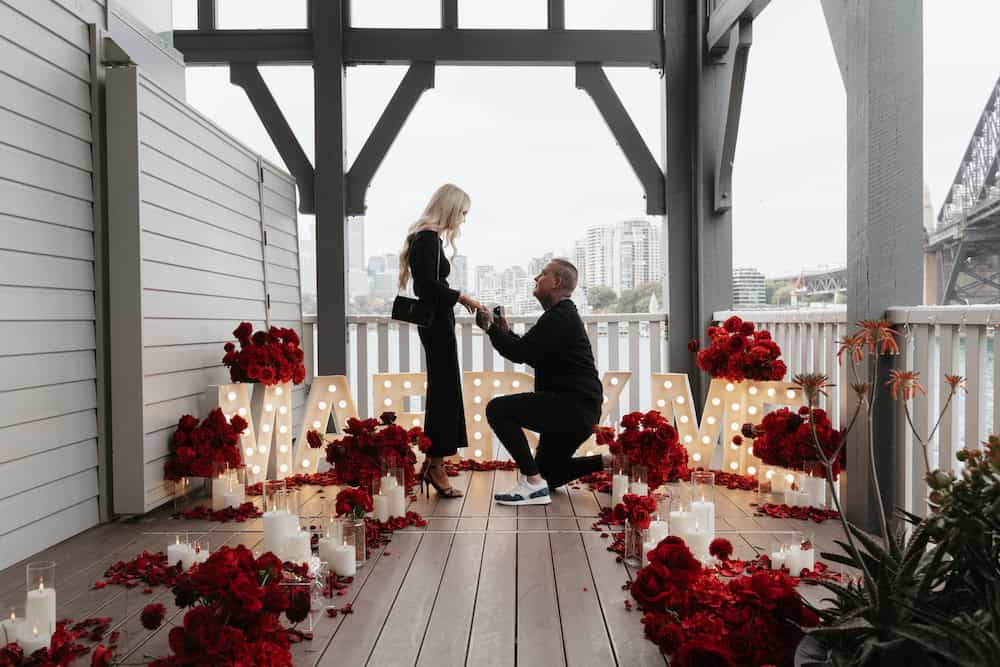The Proposal: Kayle surprised Summer with a beautiful balcony proposal with stunning views of the Harbour Bridge at Pier One Sydney Harbour. Decorated with gorgeous