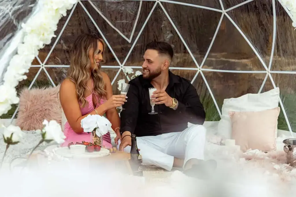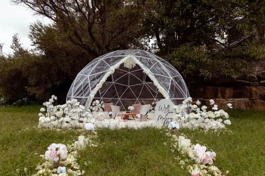 Chris surprised Brooke with an enchanted Igloo proposal overlooking the Sydney Harbour! The Igloo proposal was perfectly private and intimate for the couple, allowing them to enjoy their love bubble after the special moment. Styled with silk white and light pink flowers, the Igloo was a picture perfect and super cosy proposal location for the couple. As Chris wanted to make sure this moment went perfectly, he engaged My Proposal Co.’s services to nail all the details!