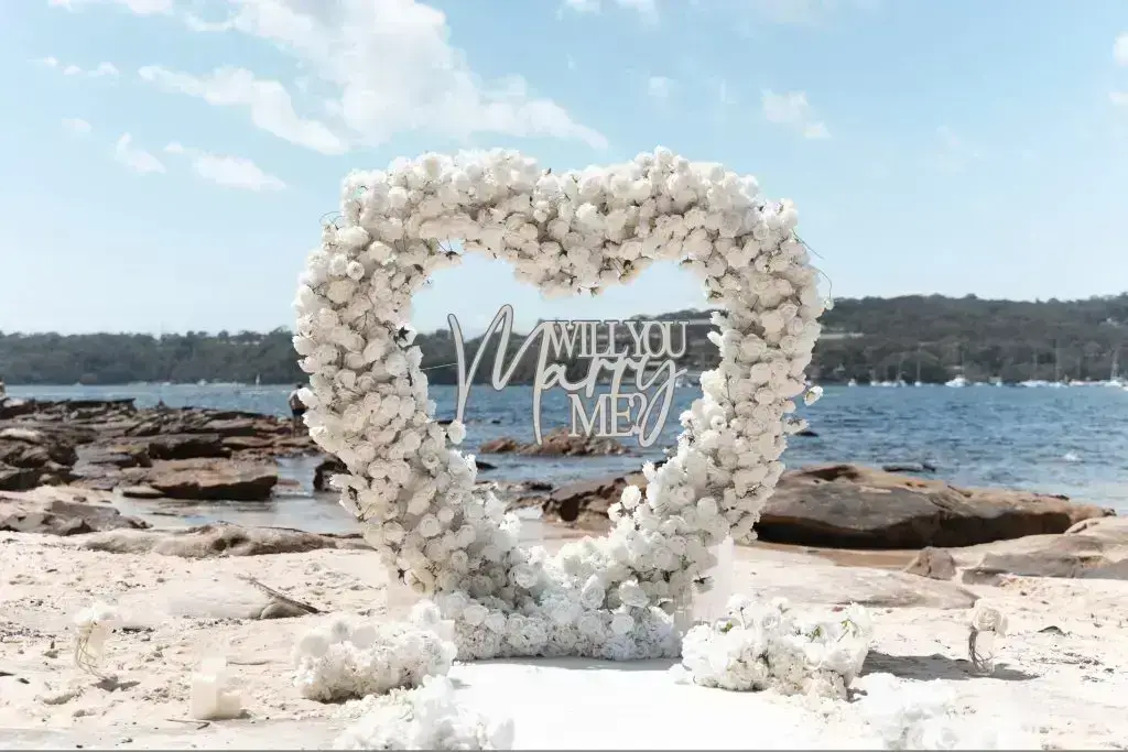 Emmanuel surprised Nora with a romantic and elegant Sydney Beach proposal. The proposal setting was styled with a grand white floral love heart, “Will You Marry Me?” sign and a white carpet aisle! Emmanuel enlisted My Proposal Co. as his thoughtful proposal planners to plan every detail of the special day!