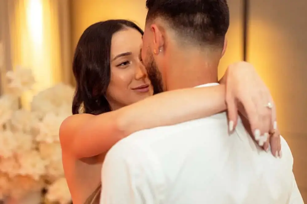 After they arrived at Crown Sydney, they checked in at the reception and made their way up to the room with their luggage. As the hotel door opened she could hear music and thought, “What the hell, that’s a first”. However they continued to walk in and around the corner saw a beautiful set up with a “Will You Marry Me” flower backdrop. Her heart was beating a million miles an hour, and she couldn’t believe what was happening! So they walked down the trail of rose petals together and she could tell he was nervous as he got down on one knee and proposed. The memory of this gorgeous hotel room proposal is something they will cherish forever!
