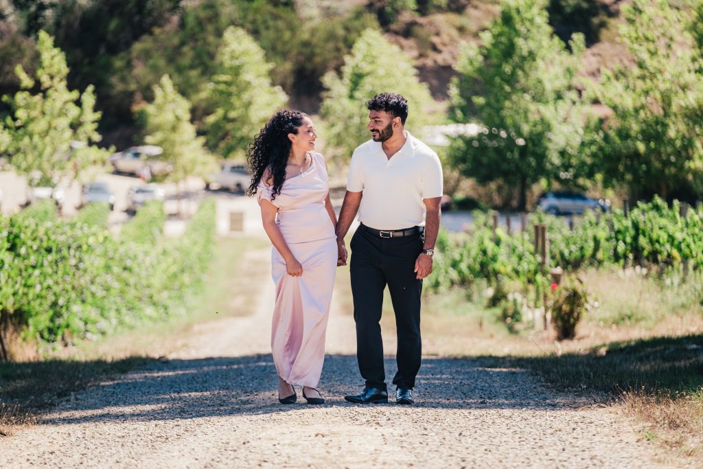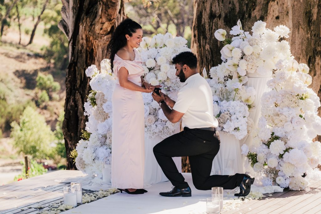 The proposal took place on a private deck alongside the lush vineyard, where a magnificent arrangement of all-white florals and glowing candles created a stunning backdrop to Reuben and Anet’s special moment. Up on the deck was also a table for two, with a grazing board paired with a finely selected sparkling wine, allowing them to linger in the magic of the moment and toast to their future together.