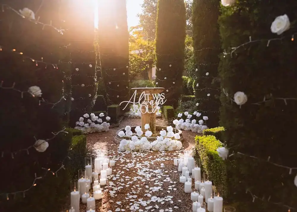 Robin surprised Olina with a gorgeous secret garden proposal, decorated with beautiful white roses, candles and a “It Was Always You” sign. Robin engaged My Proposal Co. as his proposal planners to make sure everything went perfectly on the big day. The secret garden was something out of a movie, perfect for him to pop the question. A professional photographer was on site to memorialise their special moment.