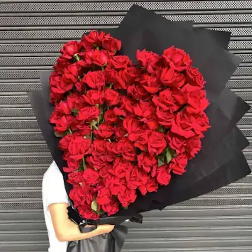 an extravagant love heart shaped bouquet made up of 80x premium red roses in luxe wrapping