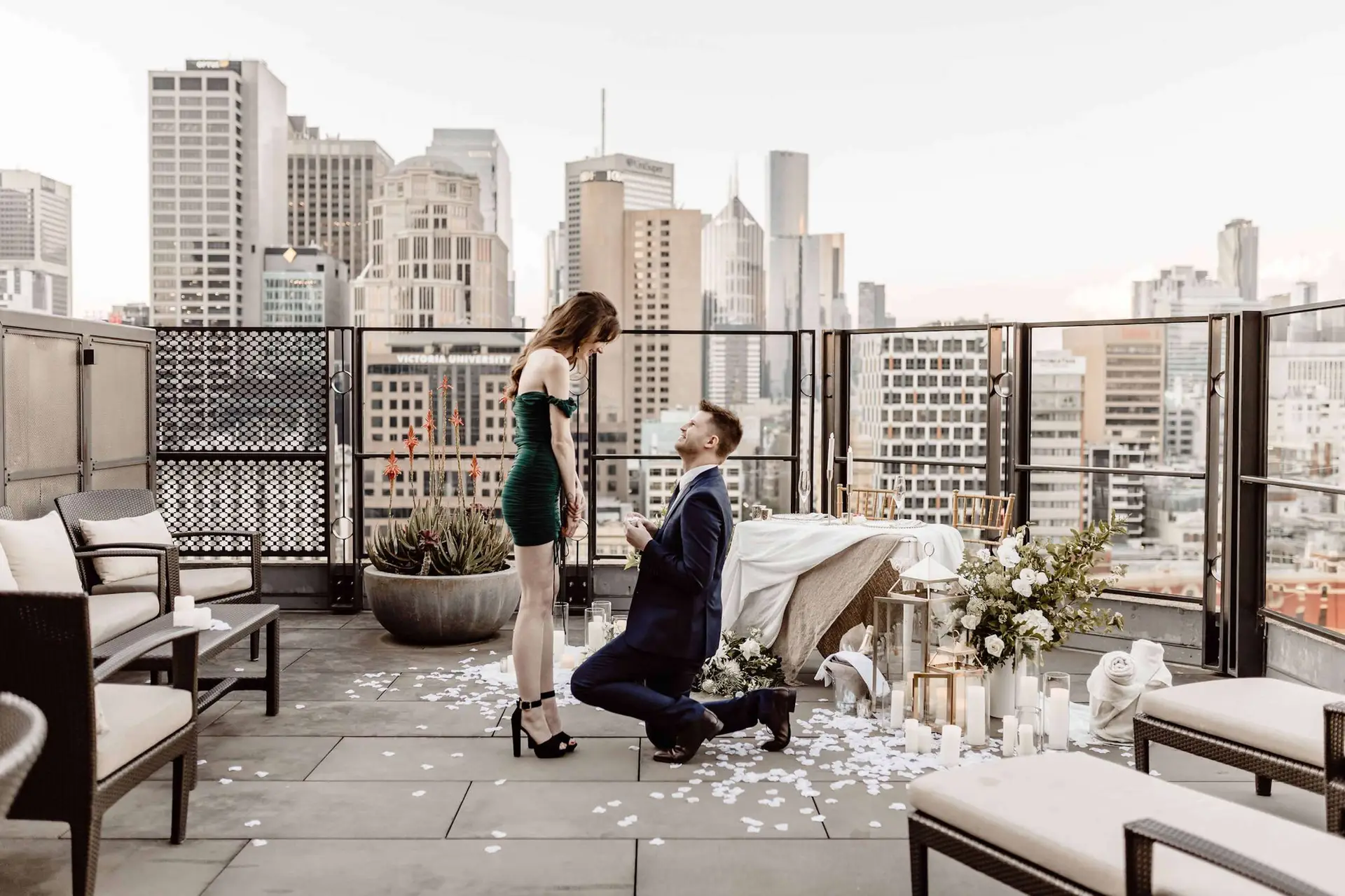 Bibo arrived at The Langham Melbourne, and Martha thought they were attending a work function. When they walked out onto the terrace, the surprise proposal setting was waiting for them!